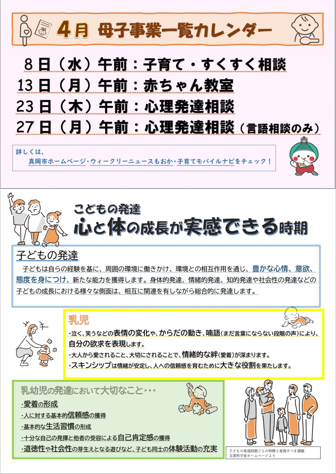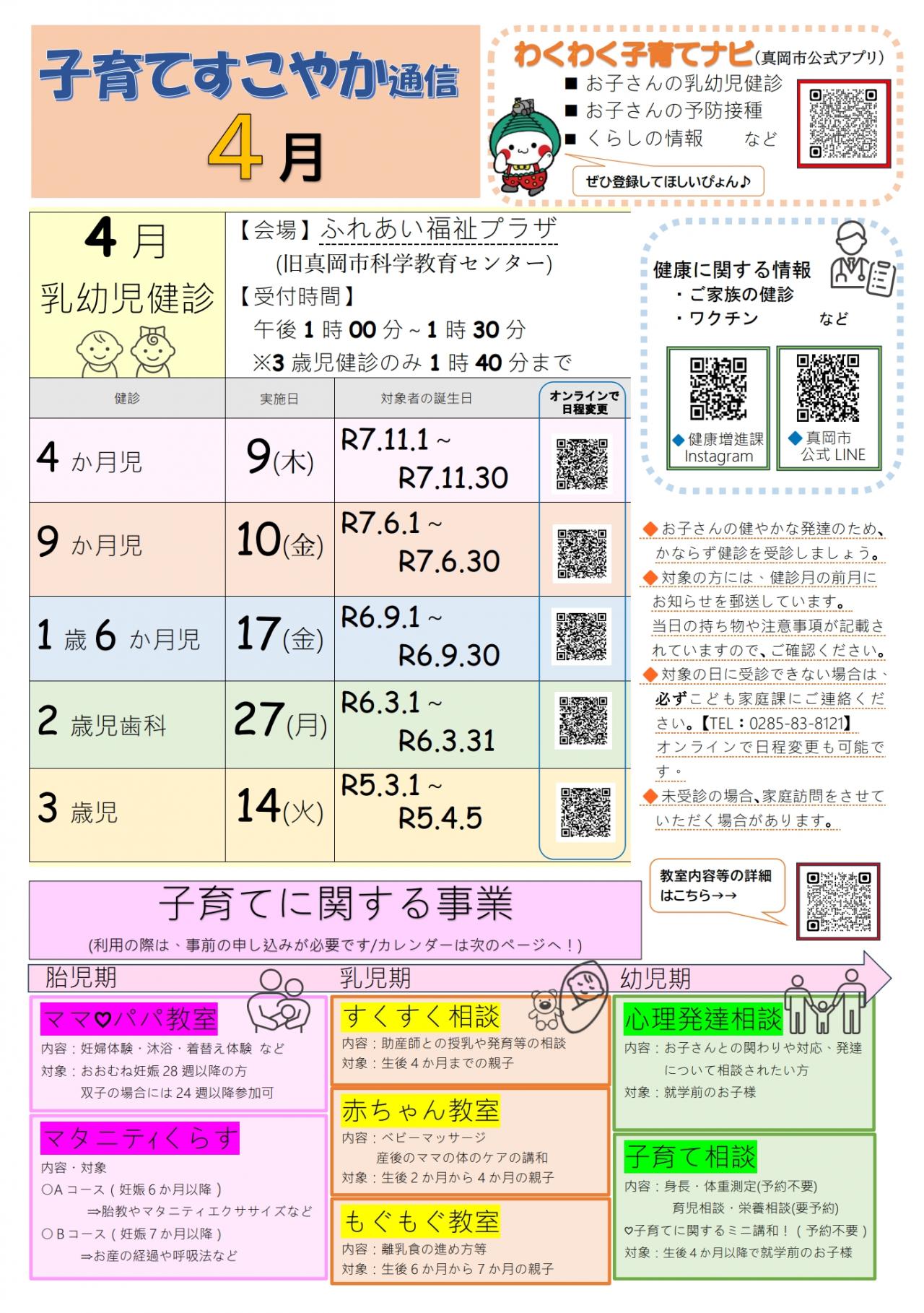 令和8年4月の各教室や乳幼児健康診査の日程、子育て情報を掲載しています。ぜひご活用ください。詳細は、子育てモバイルナビ「こどもの健診」「教室・相談会」やこども家庭課ホームページでご確認ください。真岡市こども家庭課母子健康係ホームページ(教室に関すること)>>詳細はこちら(乳幼児健康診査に関すること)>>詳細はこちら