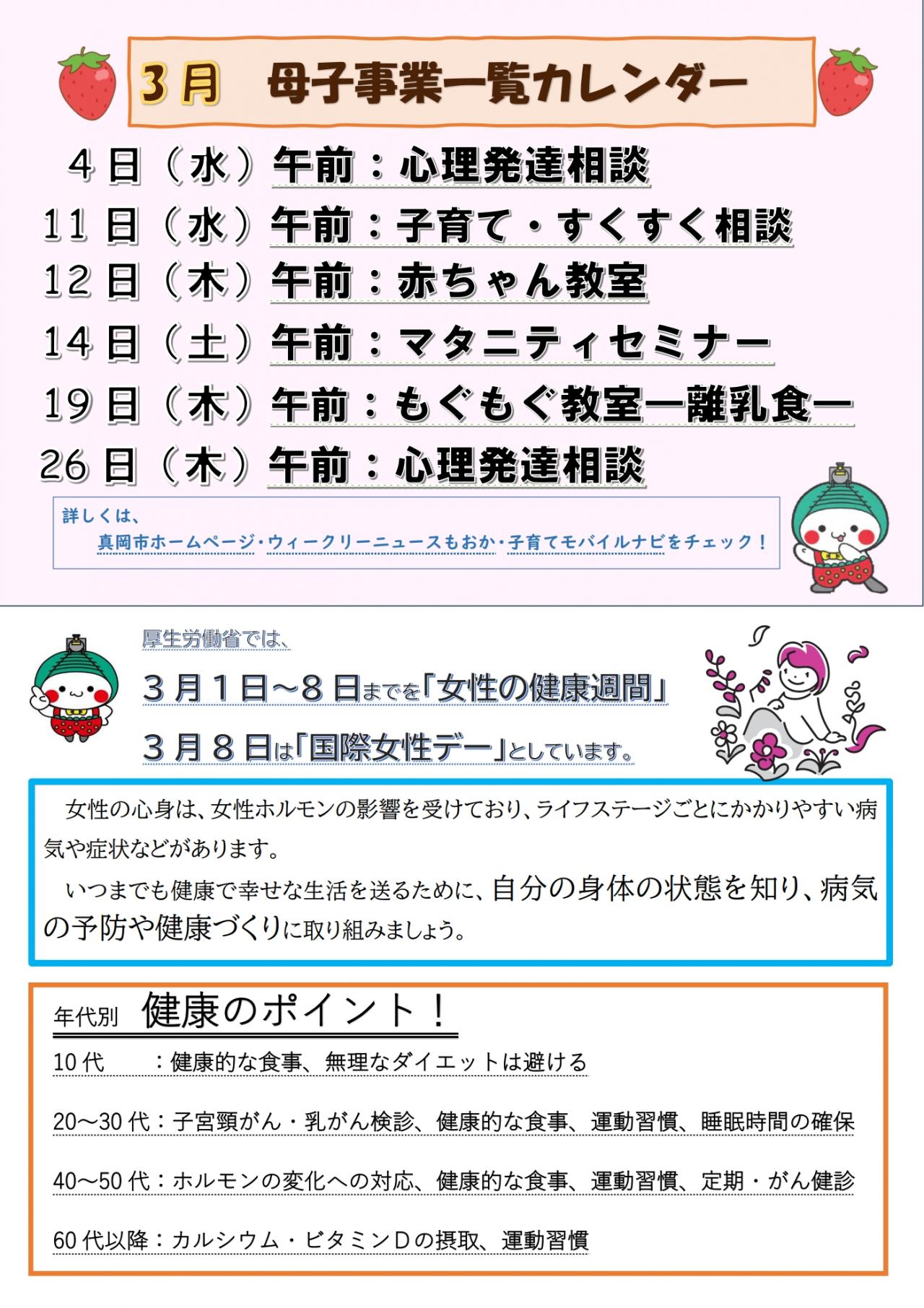 令和8年3月の各教室や乳幼児健康診査の日程、子育て情報を掲載しています。ぜひご活用ください。詳細は、子育てモバイルナビ「こどもの健診」「教室・相談会」やこども家庭課ホームページでご確認ください。真岡市こども家庭課母子健康係ホームページ(教室に関すること)>>詳細はこちら(乳幼児健康診査に関すること)>>詳細はこちら